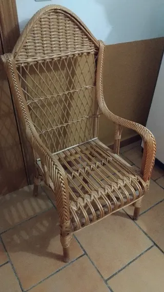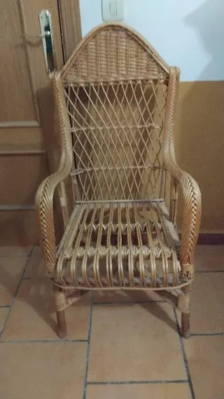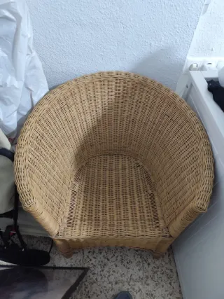 Butaca de mimbre con uso pero con un lavado de cara se puede aprovechar. La estructura está bien y sólo se ve algún arañazo (en las fotos)