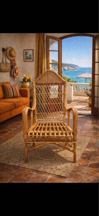 Elegante silla o butaca de mimbre con un diseño clásico y natural. Aporta un toque acogedor a cualquier espacio. - Estructura de ratán. - Acabado en tonos beige y marrón.
