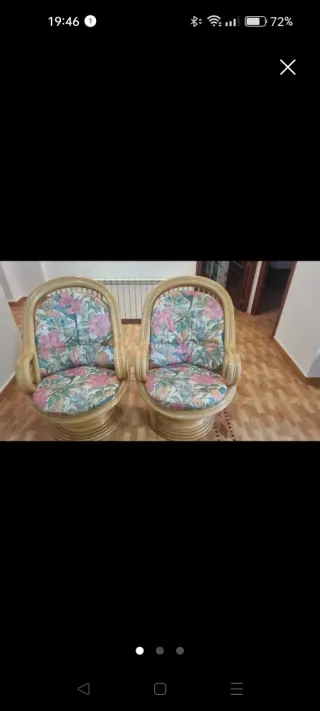 Conjunto de dos elegantes butacas de mimbre con cojines. - Estructura de mimbre resistente y duradera. - Cojines con estampado floral y detalles en tonos verdes y rosas. - Diseño envolvente y cómodo. - Base giratoria para mayor versatilidad.