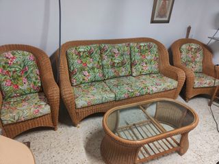 SOFA..BUTACONES..MESITA DE MIMBRE EN PERFECTO ESTADO..COMO NUEVO Y CON POQUISIMO USO. - Incluye un sofá de tres plazas. - Dos butacas individuales. - Una mesa de centro con tapa de cristal.