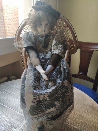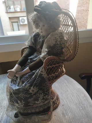 Muñeca cerámica vintage con silla mimbre