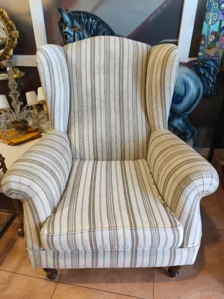Butaca orejera en perfecto estado, con un diseño clásico y elegante. Muy cómoda. - Tapicería de tela con estampado de rayas verticales. - Tonos beige y marrón claro, muy combinable en cualquier decoración. - Patas de madera oscura.