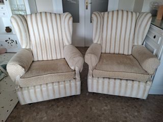 Se venden dos butacas orejeras clásicas en buen estado. Son cómodas y elegantes, perfectas para cualquier salón. - Tapicería de tela. - Color beige y blanco.
