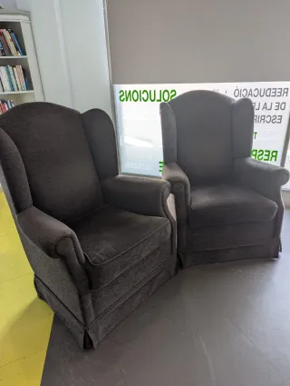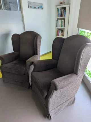 Conjunto de dos butacas orejeras con un diseño clásico y acogedor. Son perfectas para crear un rincón de lectura o añadir un asiento extra con estilo. - Tapicería de tela. - Color marrón y gris. 100€ unidad.