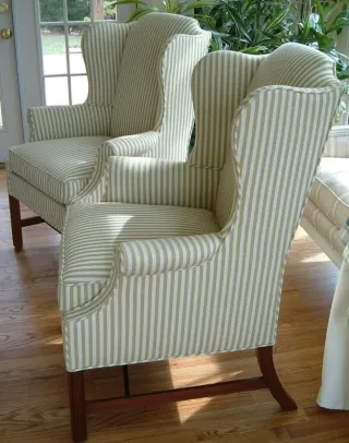 Conjunto de dos butacas orejeras de estilo clásico. Presentan un diseño de rayas verticales en tonos beige y blanco, aportando elegancia a cualquier espacio. - Diseño de rayas verticales. - Tapicería de tela.