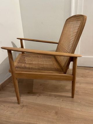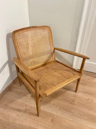 Butaca de diseño de Zara Home, descatalogada y muy buscada. - Estructura de madera natural. - Asiento y respaldo de ratán tejido. - Diseño escandinavo moderno.
