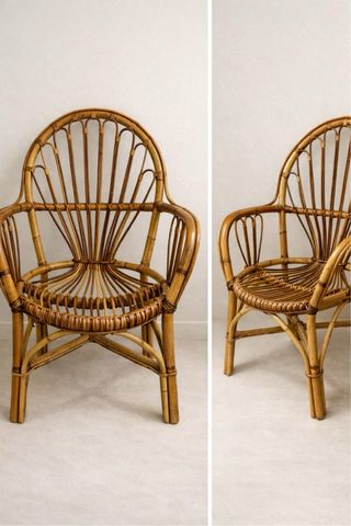 Pack de 3 sillas de ratán natural estilo Peacock, auténtico diseño vintage con estructura sólida y líneas artesanales espectaculares. Tonos miel elegantes, perfectas para salón, dormitorio, terraza cubierta o proyecto deco boho / mediterráneo. Piezas con presencia editorial tipo revista. Muy buen estado estructural. Se venden juntas para conjunto armónico. Oportunidad única. Posibilidad de entrega en mano. Ideal interioristas y amantes del diseño natural.