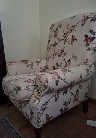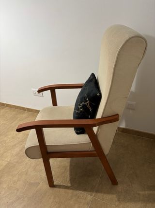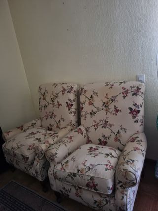 Pareja de sillones individuales de tela, color beige claro. Ideales para un espacio pequeño. Se encuentran en perfecto estado. Son módulos, fáciles de transportar y colocar en cualquier sitio. Cojines con cremallera para lavar en lavadora. Muy poco uso, solo de vista. Entrega en mano. Posibilidad de llevarlo hasta el portal en Cáceres. Tresillo sillones butacas sillas butacones mueble armario cama dormitorio salón comedor lámpara armario lámpara ventilador mesas mesillas zapatero - Diseño clásico con respaldo alto. - Tapicería con estampado de hojas. - Dos sillones incluidos.