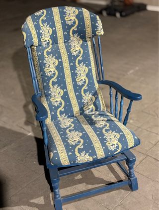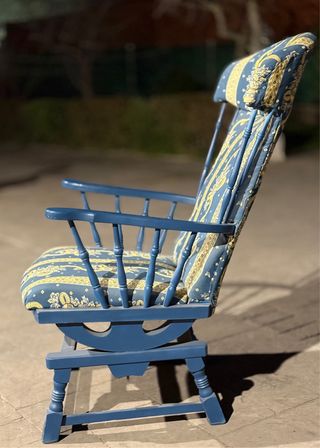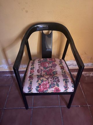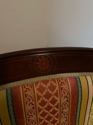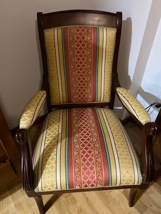 Elegante butaca con detalles tallados en la madera y un bonito tapizado. - Patas y brazos de madera con tallado artesanal. - Tapicería de tela con diseño de rayas y motivos florales. - Cojín decorativo a juego incluido. a recoger en Cáceres.