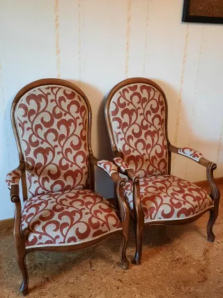 Elegante par de butacas de estilo Isabelino. Presentan un diseño clásico con un tapizado llamativo. Muy cómodas, solo venta en persona. Se venden por cambio de domicilio - Estructura de madera de roble - Tapicería de tela con estampado. - Color principal del estampado: rojo. - Color secundario del estampado: marrón.