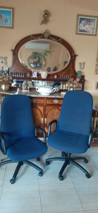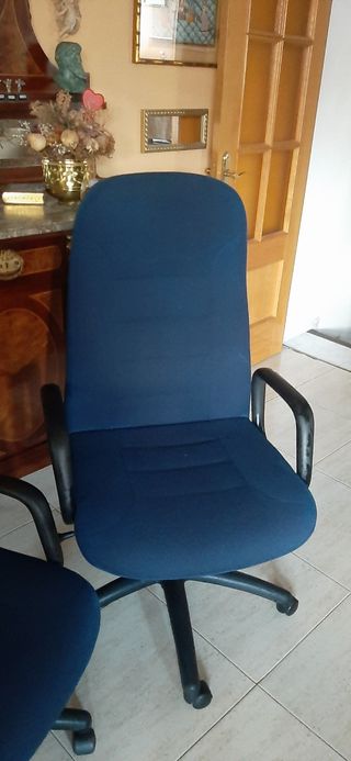Sillones o butacas con ruedas, de respaldo alto, con altura regulable, muy buen acolchado se puede trabajar muchas horas sentado en el, tapicería azul también en perfecto estado. Altura con el asiento bajado desde el suelo 40 cm. Subido 50 cm. Dimensiones del asiento 55×50. Altura del respaldo desde el asiento 66 cm. Una unidad 42€ las dos 79€