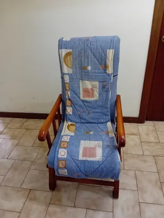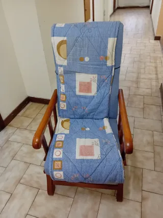Cómodo sillón con un diseño moderno y estampado. Se mece. Hace de mecedora. Es muy ligera. Está en el Barrio de Gros - Patas de madera. - Tapizado en tela con estampado. - Brazos de madera.
