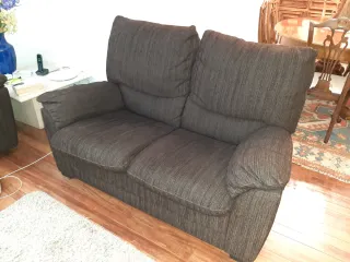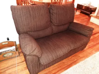 Sofá de dos plazas con un diseño moderno y acogedor. Su tapicería de tela le da un toque cálido y confortable. - Tapicería de tela. - Color marrón oscuro. - Se vende si se quiere con dos butacas de la misma tela. El sofá a se entrega en la casa, sacarlo a la calle es a cuenta del comprador. Hay unos 30 escalones.