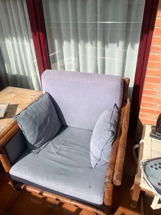 Conjunto de dos butacas de estilo balinés, perfectas para tu espacio exterior. Su diseño combina materiales naturales para un toque acogedor. - Estructura principal de bambú. - Cojines de tela en tono grisáceo. - Acabado rústico y elegante. - son una preciosidad originarias de Bali - estan para limpiar - las dos 50 euros