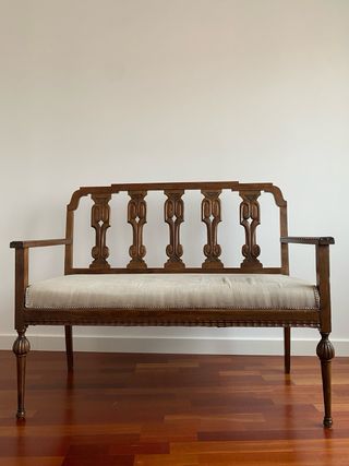 Conjunto compuesto por un banco tresillo de tres plazas y una butaca a juego, ambos de estilo castellano mediados siglo XX. Fabricados en madera maciza con un acabado oscuro que resalta su robustez y calidad artesanal. El respaldo presenta un diseño calado con motivos geométricos, característico del renacimiento español. En buen estado de conservación con ligeros signos de uso que realzan su carácter vintage. En algún momento de su historia, el conjunto ha tenido carcoma, pero ha sido tratado adecuadamente. Actualmente, la madera se encuentra en muy buen estado, con un acabado lustroso y solo conserva los pequeños agujeros característicos que evidencian el pasado tratamiento. Ha sido retapizado y presenta algunas manchas visibles. Para mas detalles echa un vistazo a todas las fotos. Tresillo 123x53x97 cm Butaca 61x51x97 cm