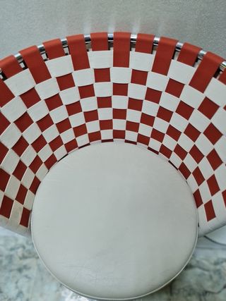 preciosa pareja de butacas que fue diseñado por Peter Maly . Este sillón giratorio tiene un cómodo asiento de cuero y un precioso respaldo de cintas de algodón trenzado. La silla está equipada con 5 patas y la estructura es de acero tubular cromado.74 cm de ancho,65 cm de profundidad