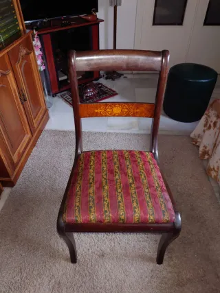 Elegantes sillas de caoba con un diseño clásico y un cómodo asiento tapizado. 4 sillas y 2 butacas - Patas delanteras curvas. - Respaldo con detalle decorativo. - Tapicería a rayas rojas y doradas.