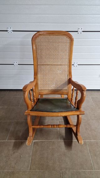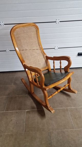 Butaca mecedora con un diseño clásico y elegante. - Estructura de madera Maciza - Respaldo de ratán. - Detalle en asiento de piel. Costó 450 euros en su momento