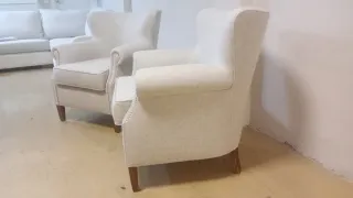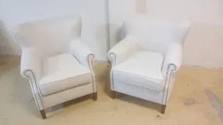 Par de butacas recién restauradas, listas para dar un toque de elegancia a tu hogar. - Tapicería de calidad en color crudo. - Estructura de madera. - Detalle de tachuelas niqueladas. Barniz repasado Miden 70 de ancho, 75 de fondo y 82 de alto La pareja se vende en 400€ y sueltas a 250€ la unidad. Muebles de muy buena calidad, nada que ver con lo que se pueda comprar en una tienda a día de hoy
