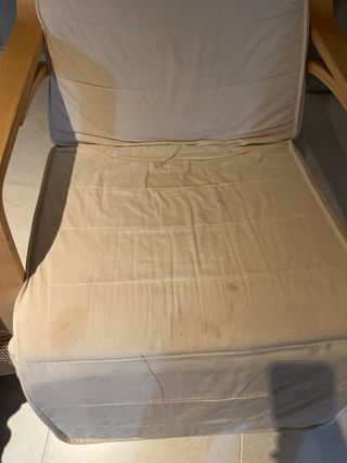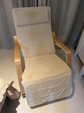 Butaca cómoda balancín. Está un poco manchada (hay niños en casa), pero se puede lavar perfectamente. - Estructura de madera resistente. - Tapicería de tela suave al tacto. - Cojín reposacabezas. - Reposa pies reclinable a diferentes alturas.