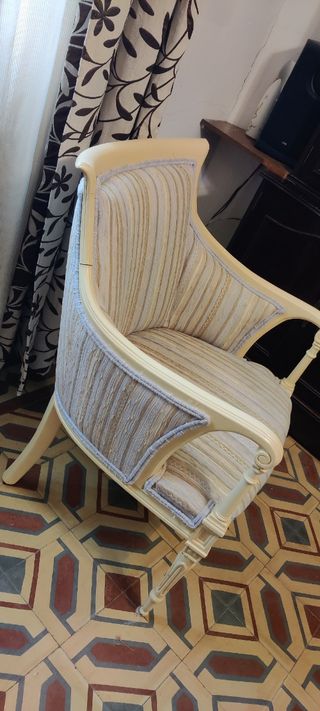 Butaca/sillón estilo gustaviano, en buen estado muy poco usado, ha sido más que de adorno. Precio no negociable EL ENVIO lo pagará EL COMPRADOR Las medidas son Ancho 64cm de brazo a brazo Alto del cojín al suelo 44cm Fondo de 62 cm, de la parte de adelante hasta zona alta del respaldo Alto desde el respaldo al suelo 84cm