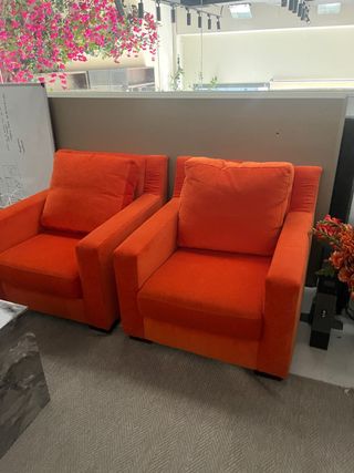 Dos butacas individuales de color naranja. Están en muy buen estado y listas para usar. - Diseño acogedor y cómodo. - Patas de madera. - Perfecta para cualquier habitación.