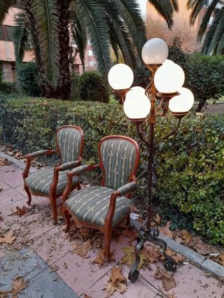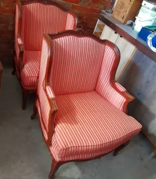 Butacas pequeñas para recibidor o habitación. Madera de buena calidad y en perfecto estado. La tapicería está para restaurar. El precio es 26 euros por cada una, las dos por 45 euros. No envío, la recogida por cuenta del comprador.