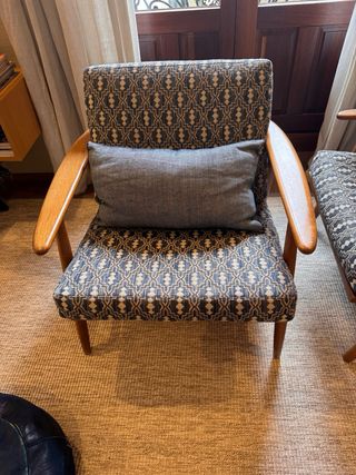 Butaca cómoda y elegante con un diseño moderno. No negociable. - Tapicería de tela con un patrón geométrico. - Patas de madera que aportan estabilidad. 90ancho x 71 fondo x 67 alto