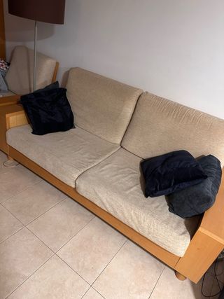 Sofá de tela y madera beige