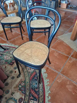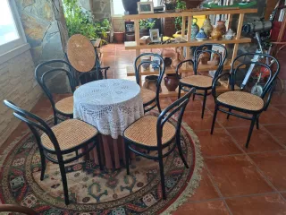 Conjunto de mobiliario de estilo Tonet, ideal para dar un toque clásico a tu hogar. Incluye 4 sillas, 2 butaca y 1 mecedora - Sillas y butacas con asiento de rejilla. - Estructura de madera curvada. - Diseño elegante y atemporal.