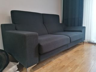 Sofá de tres plazas de diseño en color negro. Medidas, 194 de largo x 93 de fondo. Butaca de medidas 96 de largo x 80 de ancho. Perfecto estado. Patas metalizadas. El sofá tiene cada brazo con un diseño distinto. NO es Ikea. No negociable. Se acaba de rebajar en más de un 20%