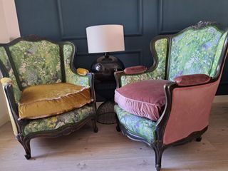 REBAJADOS**** EL CONJUNTO A 390****Sillones antiguos estilo isabelino totalmente restaurados, tapizados en tela estampada de flores y terciopelo color dorado y rosa viejo, con la madera decapada color carbón. Este anuncio es para el sillón color dorado, para el rosa ir a mi perfil. Para envíos en la comunidad de Madrid, contactar por chat.