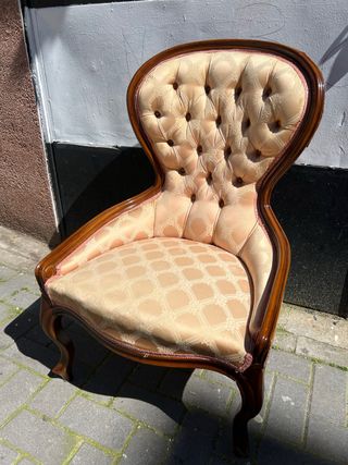 Elegante butaca de estilo antiguo, con un diseño clásico y confortable. Tiene una pequeña reparación en la parte inferior como se puede ver en las fotos . Recientemente tapizada. Medidas : altura espalada 106 cm, ancho total 64 cm, altura donde te sientas 48 .cm - Estructura de madera robusta. - Tapicería de polipiel de alta calidad. - Detalles ornamentales en el respaldo y brazos.