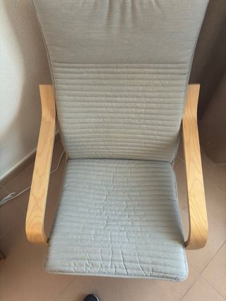 Butaca Poang de Ikea con reposapiés a juego. Siempre se ha utilizado con un cubre sofá o manta, en las fotos parece manchado pero es efecto de la luz. - Estructura de madera curvada. - Cojines de tela en tono beige.