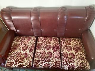 Sofá de piel color burdeos, con asientos recubiertos de tela aterciopelada con estampado floral. 3 plazas. Posibilidad de comprar con 2 butacas individuales a juego (ver en mi perfil).