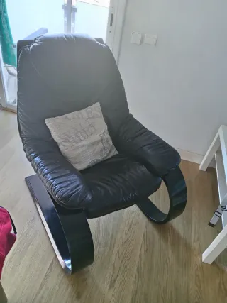 Preciosa butaca de diseño, perfecta para relajarse. Es cómoda y está en muy buen estado. - Estructura de madera. - Acolchado mullido. - forrada en Piel, de muy buena calidad, está en perfectas condiciones