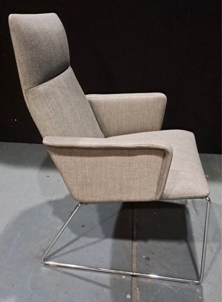 Butaca de diseño, nueva tapizada en gris. Es una butaca singular, que ofrece una ergonomía extraordinaria. Se compone de butacas con asiento y respaldo tapizados. Se presenta con base de patín de varilla de acero. Es un asiento concebido para hablar, para relacionarse sin prisas, ideal para cualquier sala de espera o lugar de descanso. Tengo 4 unidades. Se hace precio por la compra de varias unidades. Precio tienda 1400€ Andreu World