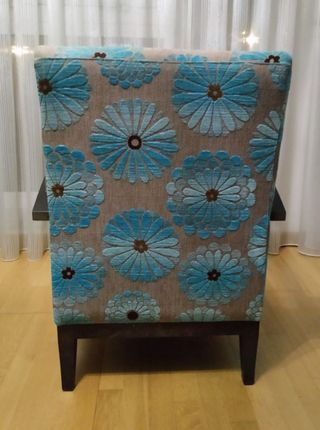 Butaca de madera con tapizado de flores. Pequeña mancha blanca en el tapizado en la zona del asiento