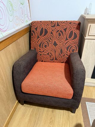 Butaca de tela en buen estado, con un diseño moderno y cómodo. - Tapicería de tela. - Tonos naranjas y rojos.