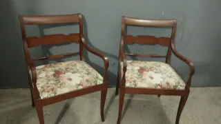 Conjunto de dos butacas de madera de caoba con asientos tapizados. - Diseño clásico con respaldo curvo. - Brazos curvos y patas elegantes. - Tapicería floral en tonos rojos y verdes.