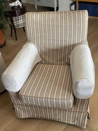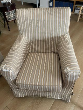 Butaca de Ikea muy cómoda, con un diseño de rayas en tonos beige y marrón. El interior esta en buen estado. Solo l funda x labarla, se ha estropeado - Funda extraíble para facilitar la limpieza. - Patas de madera robustas. 85 de alto 45 de fondo de asiento 40 cm la altura del asiento al suelo
