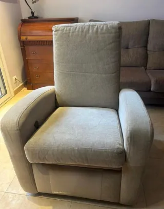 Butaca reclinable de tela en color gris. Un mueble cómodo y elegante para tu hogar. 2 unidades, 60 cada una.Se encuentran en Sabadell. Tienen alguna rascada de mi gto pero estan bastante bien....se puede ver sin compromiso. -Patas de madera oscura. - Respaldo alto y mullido.