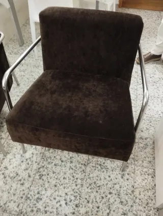 Butaca con un diseño moderno y confortable.Altura máxima 80 cms. Precio unidad.Tengo 4 unidades - Tapicería en tela. - Estructura de metal. - Color marrón y plateado.