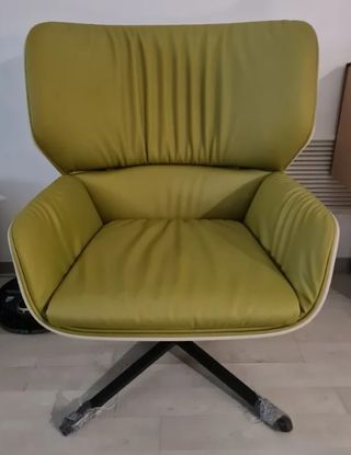Butaca de Andreu World, modelo Nuez Bio Lounge. Diseñado por Patricia Urquiola. Color tela amarillo suave. Respaldo alto con carcasa de termopolímero Bio, asiento y respaldo plafonado y base central giratoria de aluminio de 4 aspas con sistema de retorno. Cuesta 2300€ en web.