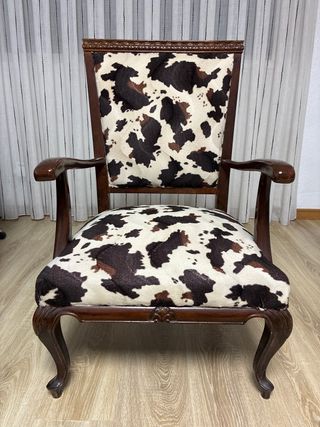 Butaca de estilo vintage con un llamativo estampado de vaca. Su estructura de madera le da un toque clásico y elegante. - Tapicería con diseño de vaca. Por grapar en la parte trasera , como indica en la foto. - Patas de madera tallada. Una de ellas rota en la parte inferior , como detalla en la foto .
