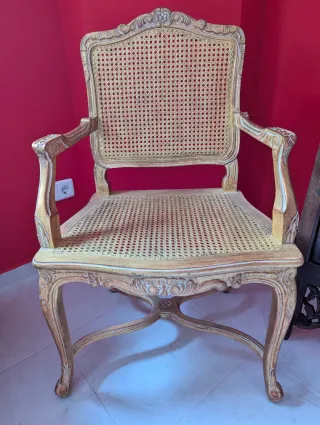 Elegante butaca de estilo clásico, perfecta para añadir un toque distinguido a cualquier espacio. - Estructura de madera con detalles tallados. - Asiento y respaldo en rejilla. - Acabado en tonos beige y dorado. Precio unidad.Tengo 2 unidades.