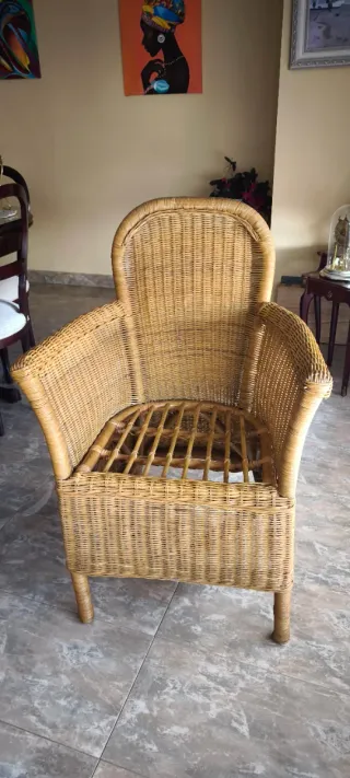 Vendo 3 butacas de ratán/mimbre con estructura resistente y diseño envolvente. Tienen un estilo natural tipo boho, mediterráneo o rústico, ideales para dar personalidad a cualquier espacio. Perfectas para: • Terraza o balcón • Porche o casa de campo • Rincón de lectura • Decoración de salón con toque natural Son butacas antiguas, por lo que se notan algo usadas estéticamente, pero están completamente funcionales y firmes. No cojean ni están rotas. El desgaste es el propio del material natural con los años, que además les da ese aire vintage. Detalles • Material: ratán / mimbre natural • Tono miel • Brazos y respaldo alto