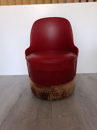 Preciosa butaca de estilo vintage. Es una pieza única que añadirá un toque de elegancia a tu hogar. - Tapizado en símil piel de color rojo. - Base con ribete de flecos. - Diseño elegante y atemporal. Esta bien escepto el bajo un pelin deteriorado.