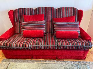 Precioso sofá vintage de los años 80. Es rojo y gris a rayas. fue tapizado personalmente en la época .Está hecho de terciopelo y tela. Incluye 4 almohadas y dos cojines cilíndricos y incluye las fundas protectoras de ambos. Mide 1,80x 1m aprox Como el sofa es antiguo para mantenerlo mas recto y que no se hunda (un poco) tiene una tabla que lo mantiene recto.