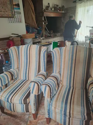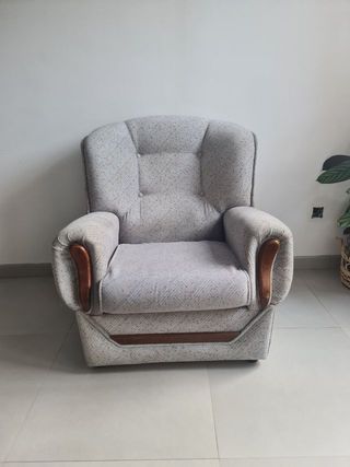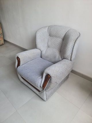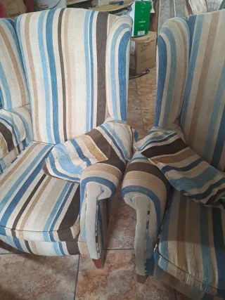 Conjunto de sofá y butaca en tela. - Sofá de dos plazas (200€) - Butaca a juego (100€) - Tapicería de tela. - Estructura de madera.